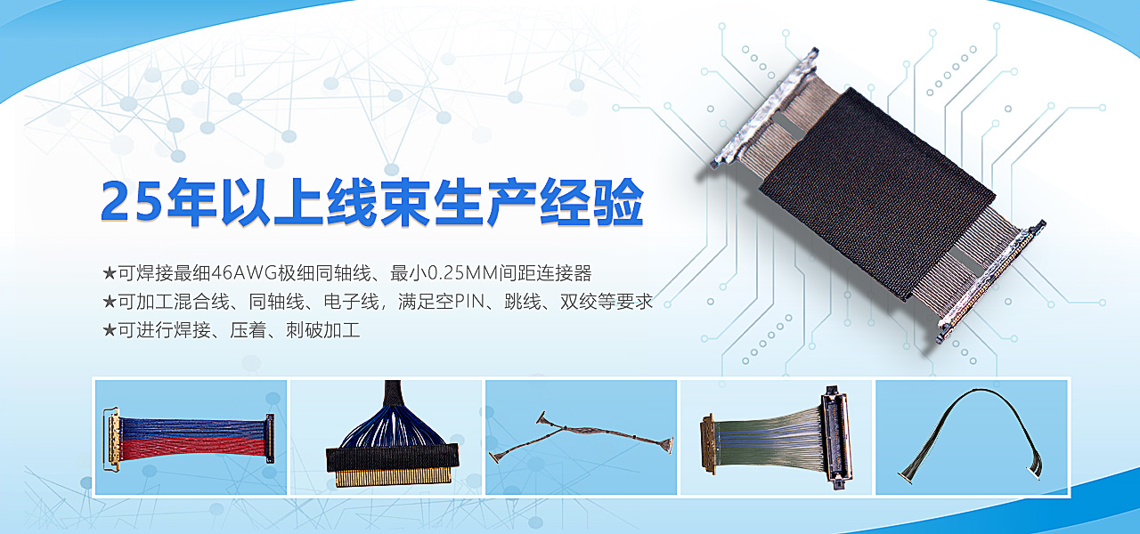 公司主營(yíng)極細(xì)同軸線束、車(chē)載信號(hào)線束、航空頭線束、RF射頻線、電子接插件、微動(dòng)開(kāi)關(guān)等